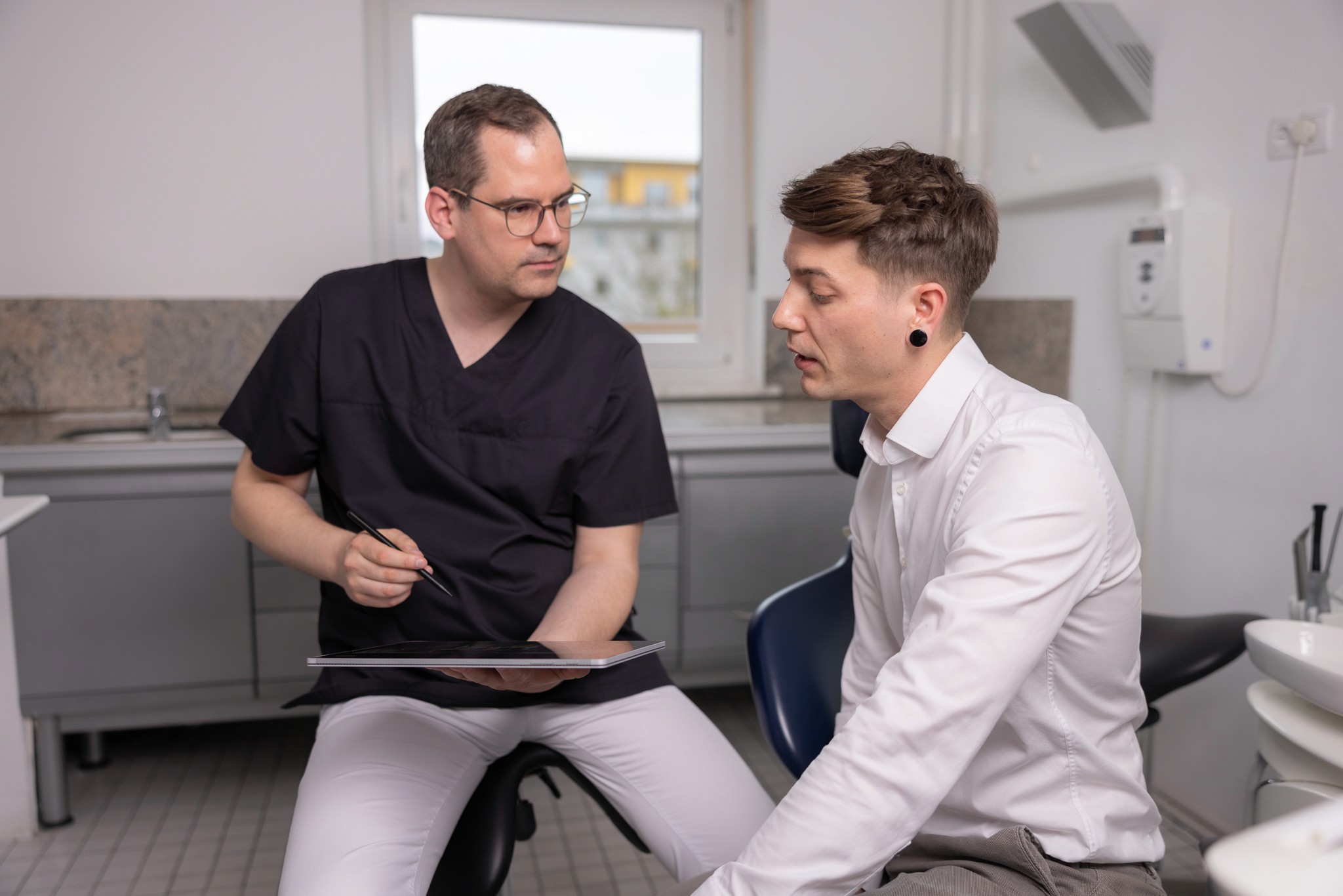 Zahnarzt und Zahntechniker arbeiten Tür an Tür.